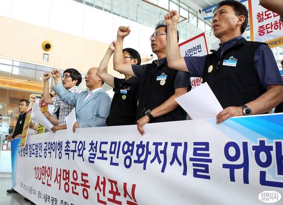 7일 오전 서울역에서 열린 '대통령의 철도발전 공약이행 촉구와 철도민영화 저지를 위한 100만인 서명운동 선포식'에서 전국철도노동조합, 민영화반대 공동행동 등 회원들이 구호를 외치고 있다.