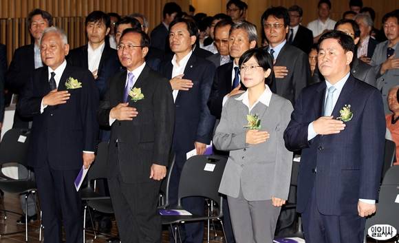 10일 오전 서울시청에서 열린 6.10 민주항쟁 기념식에 참석한 내빈들이 국기에 대한 경례를 하고 있다. 사진 왼쪽부터 김한길 민주당 대표, 노회찬 진보정의당 공동대표, 이정희 통합진보당 대표, 최경환 새누리당 원내대표.