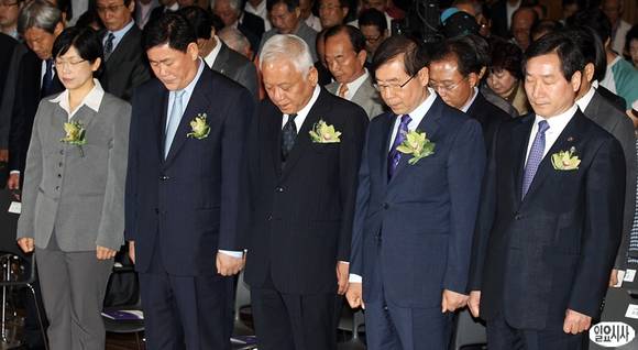 10일 오전 서울시청에서 열린 6.10 민주항쟁 기념식에 참석한 내빈들이 묵념을 하고 있다. 사진 왼쪽부터 이정희 통합진보당 대표, 최경환 새누리당 원내대표, 김한길 민주당 대표, 박원순 서울시장, 유정복 안전행정부 장관.