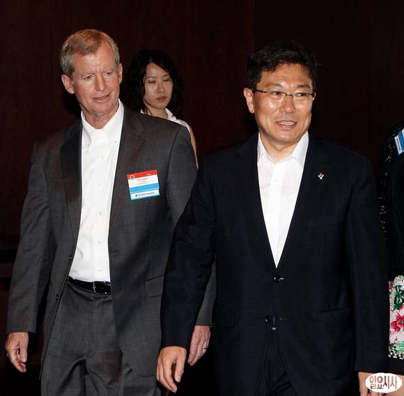 윤상직 산업통상자원부 장관(오른쪽)이 10일 서울 남산 하얏트호텔에서 열린 주한미국상공회의소(AMCHAM) 초청 오찬간담회에 참석하고 있다.