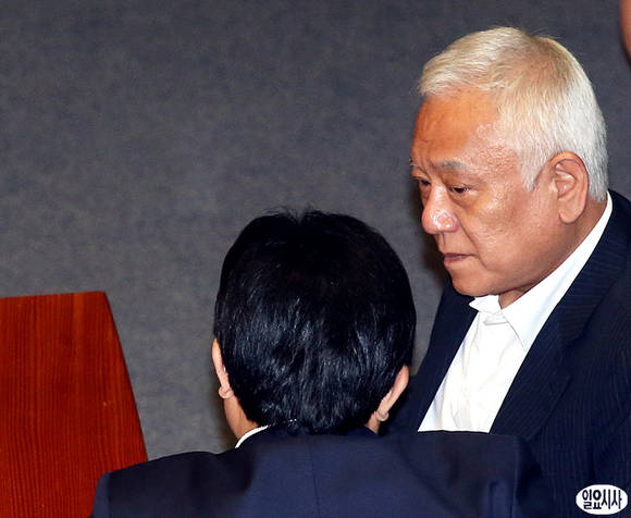 김한길 민주당 대표가 10일 서울 여의도 국회 본회의장에서 심각한 표정으로 동료 의원을 바라보고 있다.
