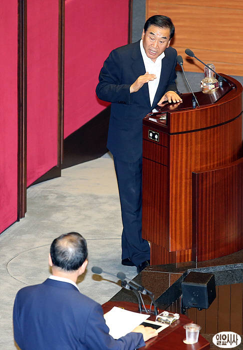 정홍원 국무총리(사진 왼쪽)가 10일 서울 여의도 국회 본회의장에서 열린 정치분야 대정부질의에서 새누리당 이재오 의원의 질의를 받고 있다.