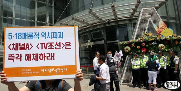 10일 오후 서울 종로구 세종로 동아일보 사옥 앞에서 열린 '5·18 왜곡보도 종편 규탄대회'에서 5·18 역사왜곡저지대책위원회 회원들이 피켓을 들고 항의를 하고 있다.