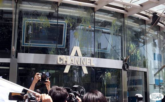 10일 오후 서울 종로구 세종로 동아일보 사옥 앞에서 열린 '5·18 왜곡보도 종편 규탄대회'에서 5·18 역사왜곡저지대책위원회 회원들이 계란을 던지고 있다.