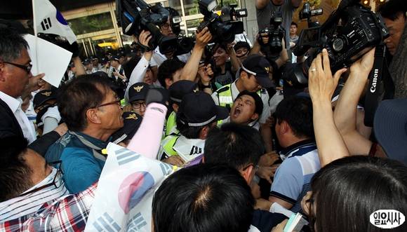 10일 오후 서울 중구 태평로 조선일보 사옥 앞에서 열린 '5·18 왜곡보도 종편 규탄대회'에서 5·18 역사왜곡저지대책위원회 회원들이 사옥으로 진입하려고 하자 경찰들이 이를 막고 있다.