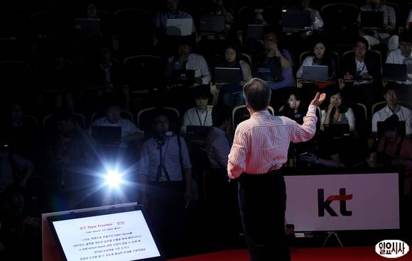이석채 KT 회장이 11일 오전 서울 KT광화문지사에서 열린 '통합 KT 출범 4주년 기자간담회'에서 프레젠테이션을 하고 있다.