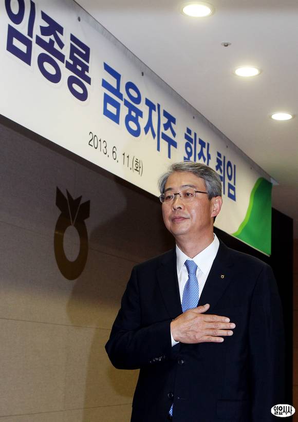 임종룡 농협금융지주 신임 회장이 11일 오전 서울 서대문 농협중앙회 본사에서 열린 취임식에서 국기에 대한 경례를 하고 있다.