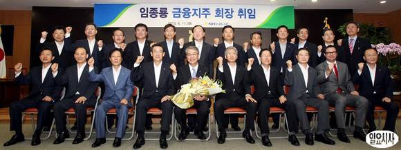 임종룡 농협금융지주 신임 회장(앞줄 왼쪽에서 다섯번째)이 11일 오전 서울 서대문 농협중앙회 본사에서 열린 취임식을 마친 뒤 임원들과 기념촬영을 하고 있다.