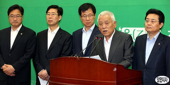 김한길 민주당 대표(사진 오른쪽에서 두 번째)가 11일 오전 서울 여의도 국회 당대표실에서 국정원 대선 개입 의혹과 관련해 긴급기자회견을 열고 있다.