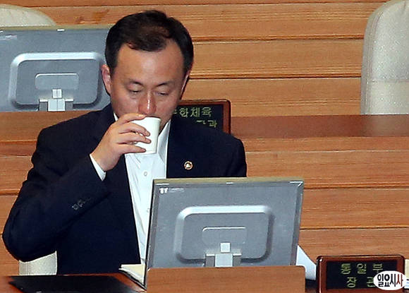 김남식 통일부 차관이 11일 오전, 서울 여의도 국회 본회의장에서 열린 외교·통일·안보 분야 대정부질문에 참석해 차례를 기다리며 목이 타는 듯 물을 들이키고 있다.
