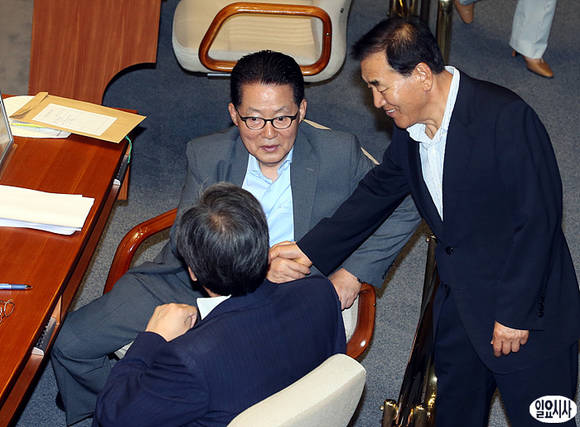 '친이계의 좌장' 이재오 의원(사진 오른쪽)과 민주당 중진의 '정치9단'으로 불리는 박지원 의원(사진 가운데)이 11일 오전, 국회 본회의장 대정부질문에 앞서 반갑게 악수를 나누고 있다.