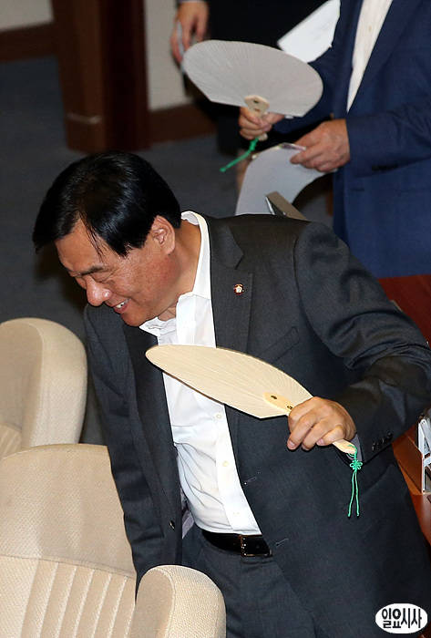 민주당 박기춘 의원(사진 오른쪽)이 11일 오전, 국회 본회의장 대정부질문에서 더운 듯 부채질을 하고 있다.