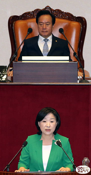 진보정의당 심상정 원내대표(사진 하단)가 11일 오전, 국회 대정부 질문에 앞서 비교섭단체 대표연설을 하고 있다.