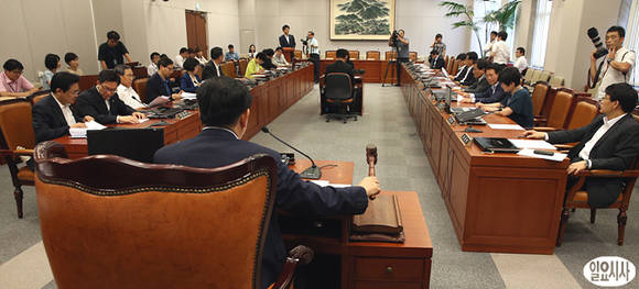 최경환 새누리당 원내대표 겸 국회 운영위원장(오른쪽)이 12일 오후 운영위 회의 종료를 알리는 의사봉을 두드리고 있다.