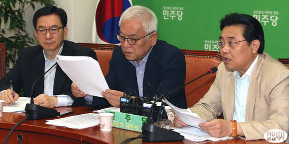 김한길 민주당 대표(사진 가운데)와 전병헌 원내대표(사진 오른쪽)가 13일 오전, 국회 원내대표실에서 열린 원내대책회의에 참석해 회의를 진행하고 있다.