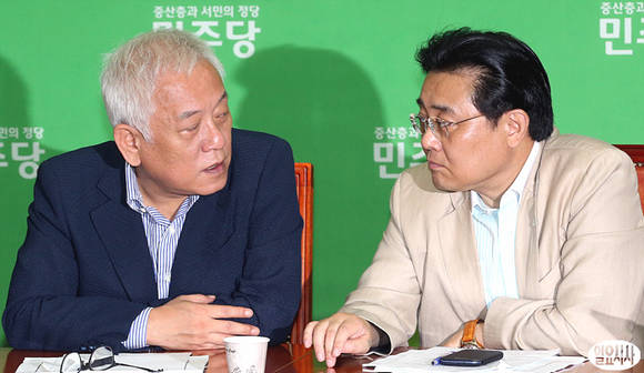김한길 민주당 대표와 전병헌 원내대표가 13일 오전, 국회 원내대표실에서 열린 원내대책회의서 대화하고 있다.