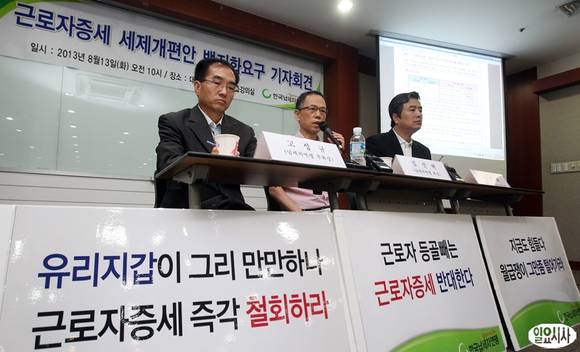 김선택 한국납세자연맹 회장(가운데)이 13일 오전 서울 중구 대우재단빌딩에서 열린 '근로자증세 세제개편안 백지화요구' 기자회견에서 발언을 하고 있다.