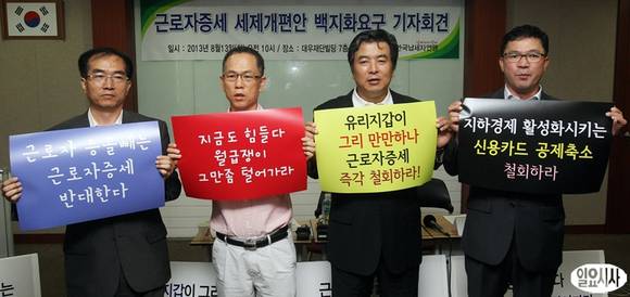 13일 오전 서울 중구 대우재단빌딩에서 열린 '근로자증세 세제개편안 백지화요구' 기자회견에서 김선택 납세자연맹 회장(왼쪽에서 두번째)을 비롯한 관계자들이 피켓을 들고 세액공제 전환 내년에 재검토를 촉구하고 있다.