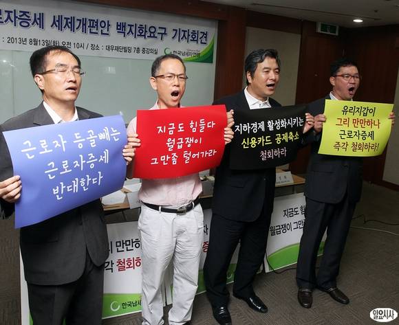 13일 오전 서울 중구 대우재단빌딩에서 열린 '근로자증세 세제개편안 백지화요구' 기자회견에서 김선택 납세자연맹 회장(왼쪽에서 두번째)을 비롯한 관계자들이 피켓을 들고 세액공제 전환 내년에 재검토'를 촉구하고 있다.