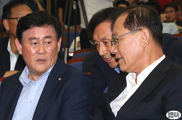황우여 새누리당 대표,(사진 오른쪽), 최경환 원내대표(사진 왼쪽), 김기현 정책위의장이 13일 오후 국회에서 열린 세제개편안 관련 정책 의원총회에 참석해 대화를 나누고 있다.
