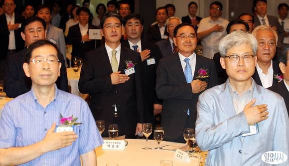 14일 오전 서울 중구 프레스센터에서 열린 한국기자협회 창립49주년 기념식에 참석한 정홍원 국무총리, 박종률 한국기자협회장을 비롯한 내빈들이 국기에 대한 경례를 하고 있다.
