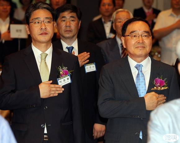 14일 오전 서울 중구 프레스센터에서 열린 한국기자협회 창립49주년 기념식에 참석한 정홍원 국무총리(오른쪽), 박종률 한국기자협회장을 비롯한 내빈들이 국기에 대한 경례를 하고 있다.