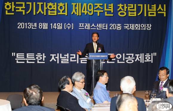 14일 오전 서울 중구 프레스센터에서 열린 한국기자협회 창립49주년 기념식에서 박종률 한국기자협회장이 인사말을 하고 있다.