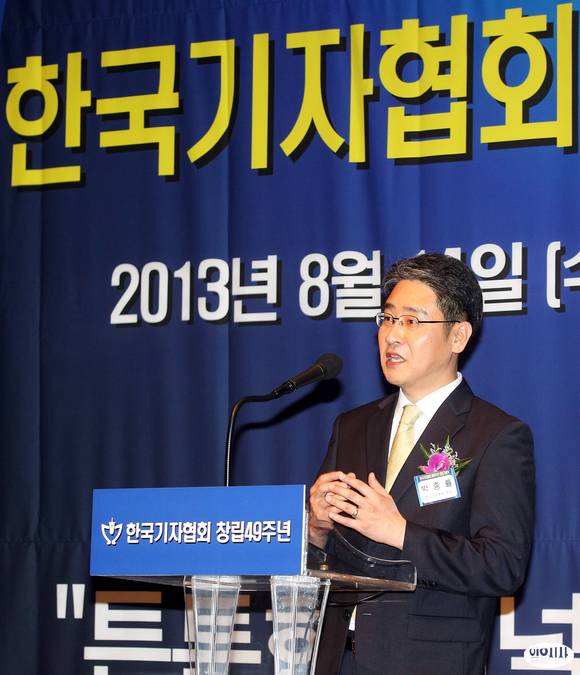 14일 오전 서울 중구 프레스센터에서 열린 한국기자협회 창립49주년 기념식에서 박종률 한국기자협회장이 인사말을 하고 있다.