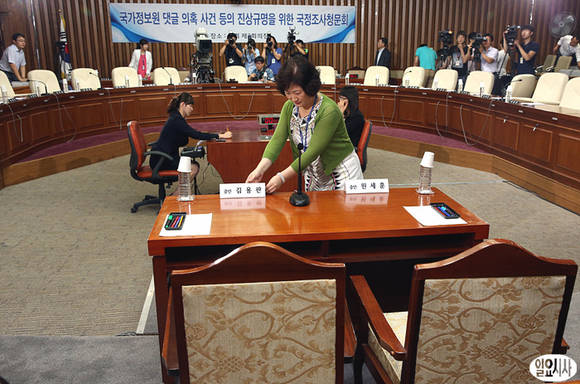 14일 오전 국회에서 국가정보원 댓글의혹 사건 등의 진상규명을 위한 국정조사청문회 직전, 국회 사무처 직원이 김용판 전 서울지방경찰청장과 원세훈 전 국정원장의 명패를 놓고 있다.