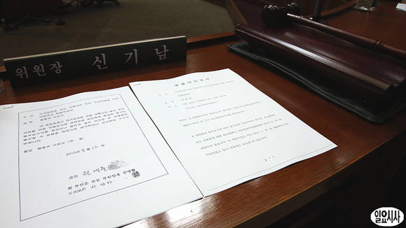 14일 오전 국회에서 국가정보원 댓글의혹 사건 등의 진상규명을 위한 국정조사 청문회가 열린 가운데, 증인인 원세훈 전 국정원장과 김용판 전 서울지방경찰청장의 불출석 사유서만 신기남 위원장 자리에 덩그러니 놓여져 있다.