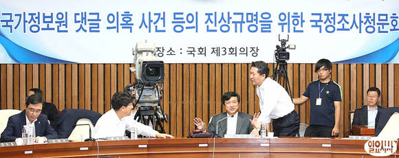 14일 오전 국회에서 국가정보원 댓글의혹 사건 등의 진상규명을 위한 국정조사청문회가 열리고 있는 가운데, 권성동 새누리당 간사와 정청래 민주당 간사가 이야기를 나누고 있다.