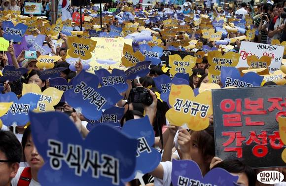 광복절을 하루 앞둔 14일 오후 서울 종로구 중학동 일본대사관 앞에서 열린 '위안부 문제 해결을 위한 1087차 정기수요집회'에서 참석자들이 손피켓을 들고 구호를 외치고 있다.