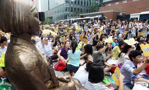 광복절을 하루 앞둔 14일 오후 서울 종로구 중학동 일본대사관 앞에서 열린 '위안부 문제 해결을 위한 1087차 정기수요집회'에서 참석자들이 손피켓을 들고 일본정부의 사죄를 촉구하고 있다.