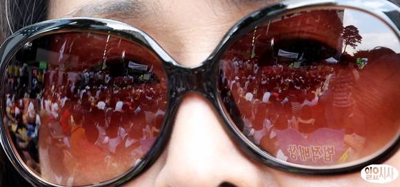 광복절을 하루 앞둔 14일 오후 서울 종로구 중학동 일본대사관 앞에서 열린 '위안부 문제 해결을 위한 1087차 정기수요집회'에서 한 참석자의 선글라스에 비친 참석자들의 모습.