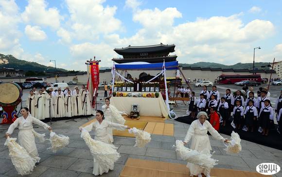 14일 서울 광화문광장에서 열린 일본군 위안부 피해자 인권회복 촉구를 위한 범 시민 진혼제에서 참가자들이 고(故) 이용녀 할머니 등 고인이 된 일본군 위안부 피해자 할머니들의 한풀이를 하고 있다.