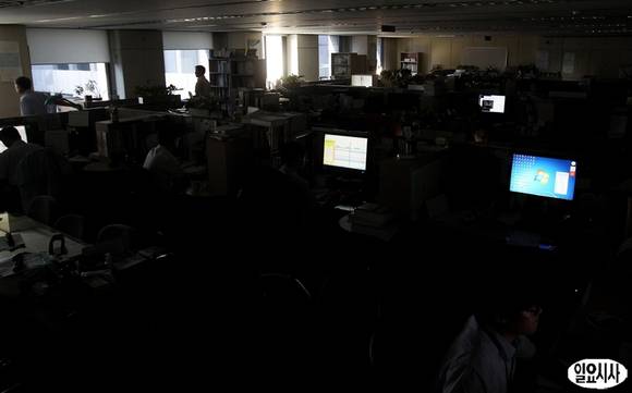 연일 계속되는 폭염으로 전국이 전력난에 허덕이는 가운데 14일 서울 삼성동 한국전력거래소 사무실에서 직원들이 에너지 절약을 위해 소등을 한 채 업무를 보고 있다.