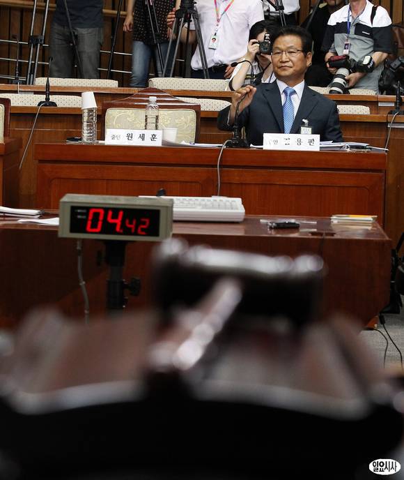 김용판 전 서울경찰청장이 16일 오전 서울 여의도 국회에서 열린 국가정보원 댓글 의혹 사건 등 진상규명을 위한 국정조사 청문회에 출석, 위원들의 질의를 경청하고 있다. 원세훈 전 국정원장은 이날 오후에 출석할 뜻을 밝혔다.