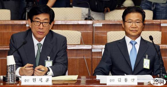 원세훈 전 국정원장(왼쪽)이 16일 오후 서울 여의도 국회에서 열린 국가정보원 댓글 의혹 사건 등 진상규명을 위한 국정조사 청문회에 출석해 위원들의 질의에 답하고 있다.