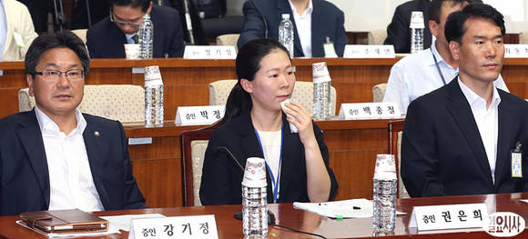 국가정보원 댓글의혹 사건 규명을 위한 국정조사 특위 2차 청문회가 19일 오전 국회에서 열린 가운데, 증인으로 출석한 민주당 강기정 의원(사진 왼쪽)과 권은희 전 수서경찰서 수사과장(사진 가운데)이 의원들의 질의를 경청하고 있다.