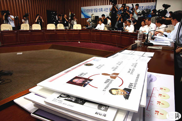 국가정보원 댓글의혹 사건 규명을 위한 국정조사 특위 2차 청문회가 19일 오전 국회에서 열린 가운데, 민주당에서 준비한 자료들이 책상 위에 올려져 있다.
