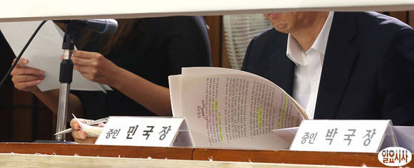 국가정보원 댓글의혹 사건 규명을 위한 국정조사 특위 2차 청문회가 19일 오후 국회에서 열린 가운데, 증인으로 출석한 국정원(좌측부터 증인 김직원, 민국장) 직원들이 커튼가림막 뒤에서 준비해 온 자료들을 확인하고 있다.
