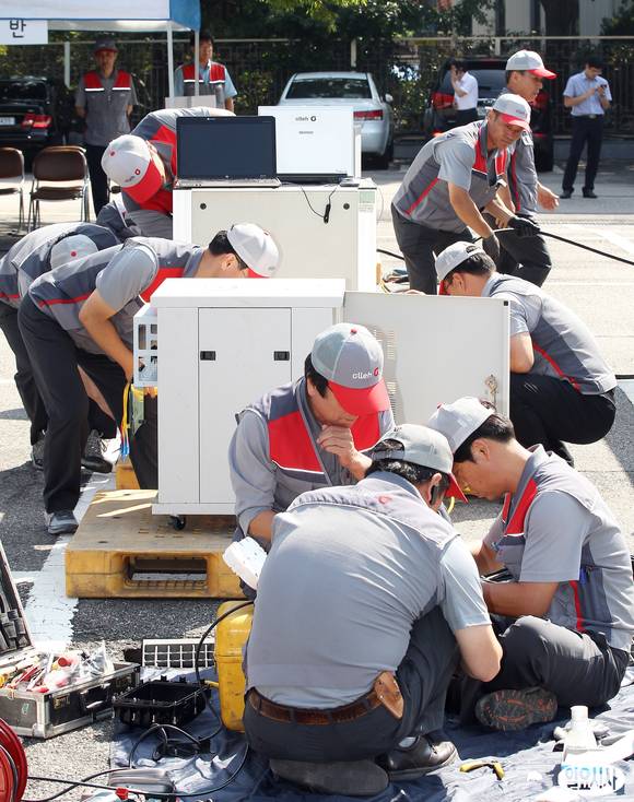 20일 오전 서울 광진구 KT광진국사에서 KT직원들이 통신시설 재난발생 등 유사 시 신속한 복구를 위한 '2013년 을지연습 KT긴급복구 실제훈련'을 실시하고 있다.