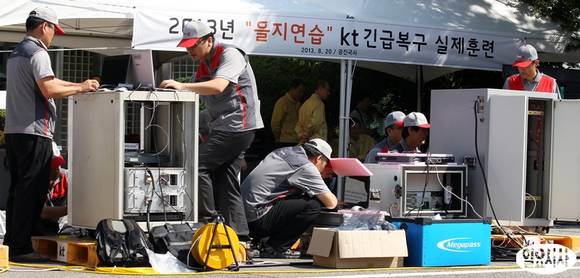 20일 오전 서울 광진구 KT광진국사에서 KT직원들이 통신시설 재난발생 등 유사 시 신속한 복구를 위한 '2013년 을지연습 KT긴급복구 실제훈련'을 실시하고 있다.