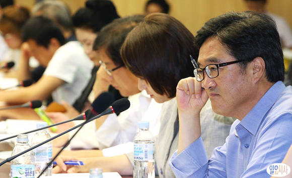 20일 오전, 국회 의원회관 세미나실에서 '민주당 을지로위원회 100일 평가 토론회'가 열리고 있는 가운데 우원식 의원이 생각에 잠겨 있다.