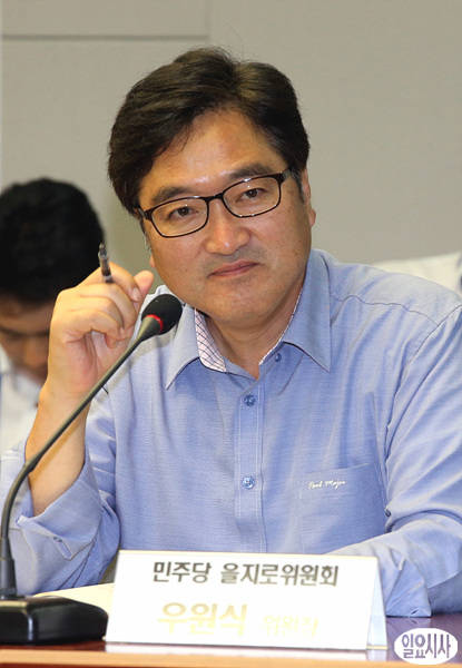 20일 오전, 국회 의원회관 세미나실에서 열린 '민주당 을지로위원회 100일 평가 토론회' 도중, 우원식 의원이 미소를 머금고 있다.