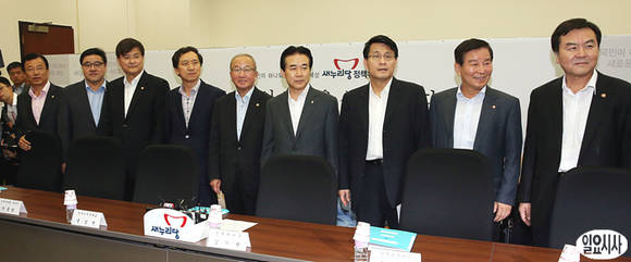 이현재, 안종범 의원, 서승환 국토교통부 장관, 김기현 정책위의장, 현오석 경제부총리, 나성린 정책위부의장, 윤상현 원내수석부대표, 박대동 의원, 신제윤 금융위원장이 포즈를 취하고 있다. (왼쪽부터)
