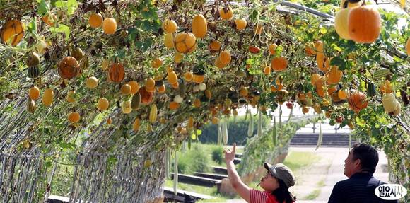 막바지 무더위가 기승을 부린 20일 오후 서울 상암동 하늘공원을 찾은 시민들이 호박터널에서 호박을 바라보고 있다.