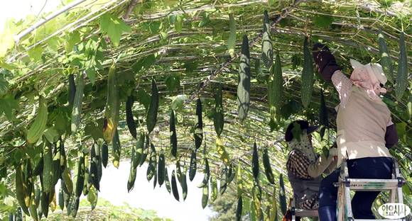 막바지 무더위가 기승을 부린 20일 오후 서울 상암동 하늘공원에서 관리자들이 수세미 줄기를 손질하고 있다.
