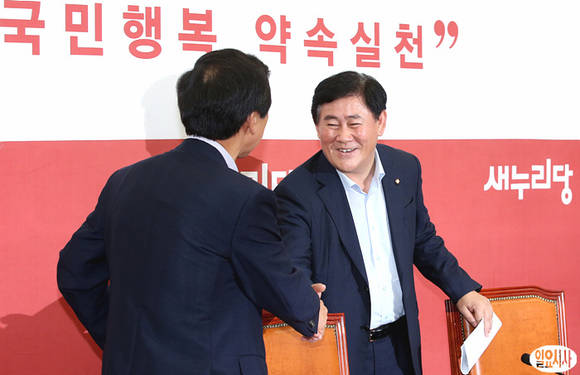 최경환 새누리당 원내대표(오른쪽)가 21일 오전, 국회 원내대표실에서 열린 취임 100일 기자간담회에서 김기현 정책위의장과 악수를 나누며 활짝 웃고 있다.
