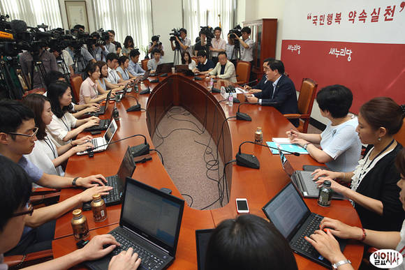 21일 오전, 국회 원내대표실에서 열린 최경환 새누리당 원내대표 취임 100일 기자간담회에 취재진들이 운집해 있다.